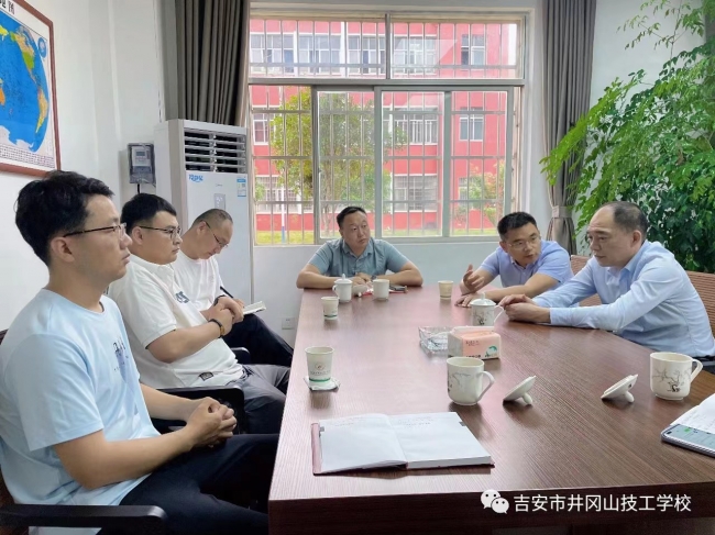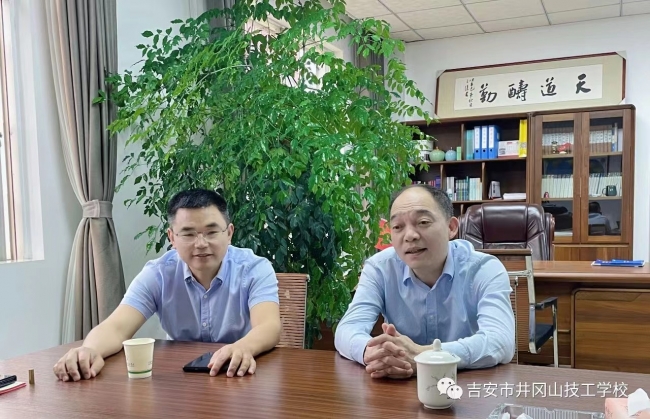 ????2023年5月6日上午,井岡山經(jīng)開區(qū)黨工委委員、組織部部長、編辦主任、人力資源和社會(huì)保障局局長黃明春一行來我??疾熘笇?dǎo)工作,東能教育集團(tuán)董事長謝偉林,副校長陳俊民等陪同。